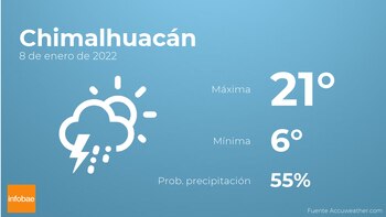 En el día de hoy en Chimalhuacán se prevén nubes y claros con probabilidad de tormentas acompañadas de lluvia. Con respecto a las temperaturas, estas se moverán entre una máxima de 21 y una mínima de 6 grados centígrados. En general, vientos del oeste de carácter flojo con cifras de hasta 22 kilómetros por hora.