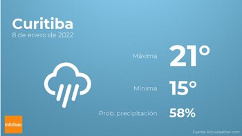 Durante el día de hoy en Curitiba el cielo estará cubierto con probabilidad de lloviznas generalizadas. Con respecto a las temperaturas, estas se moverán entre una máxima de 21 y una mínima de 15 grados. Además, se esperan vientos sin apenas intensidad con valores de hasta 41 kilómetros por hora.
