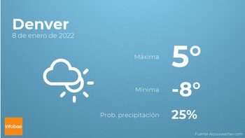 En la mañana de hoy en Denver se prevén más nubes que claros con poca probabilidad de precipitaciones. Por la tarde habrá nubes y claros con poca probabilidad de lluvias. Con respecto a las temperaturas, variarán entre una máxima de 5 y una mínima de -8 grados. Viento de poca intensidad con valores de hasta 22 km/h.