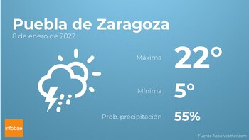 En el día de hoy en Puebla de Zaragoza tendremos nubes y claros con probabilidad de tormentas y lluvia. Con respecto a las temperaturas, estas oscilarán entre los 22 grados de máxima y 5 de mínima. Además, se esperan vientos del oeste sin apenas intensidad con valores de hasta 28 km/h.