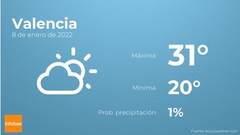 Hoy en Valencia se espera nubes escasas. En cuanto a las temperaturas, estas oscilarán entre los 31 grados de máxima y 20 de mínima. Además, se esperan vientos del norte de poca intensidad con valores de hasta 32 km/h.