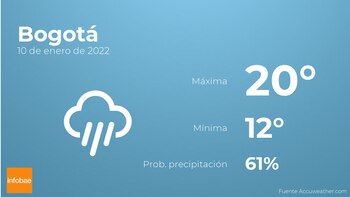 Para hoy por la mañana en Bogotá se prevén cielos cubiertos con probabilidad de alguna llovizna. Por la tarde se esperan cielos cubiertos con lloviznas generalizadas. Con respecto a las temperaturas, oscilarán entre una máxima de 20 y una mínima de 12 grados centígrados. Junto a todo esto, se esperan vientos del noroeste sin apenas intensidad con rachas de hasta 32 km/h.