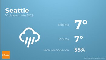Para el día de hoy en Seattle tendremos cielos cubiertos con probabilidad de alguna llovizna. Con respecto a las temperaturas, estas se moverán entre una máxima de 7 y una mínima de 7 grados centígrados. Además, se esperan vientos de carácter débil con cifras de hasta 15 kilómetros por hora.
