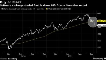 De hecho, los contratos de futuros que siguen al Nasdaq 100 bajaron un 1,2% el lunes, al tiempo que los rendimientos de las notas del Tesoro a 10 años de Estados Unidos se acercan al 1,80%. El índice de alta ponderación de acciones tecnológicas ha perdido casi un 6% desde fines del año pasado, principalmente a causa de las empresas de software: las acciones seguidas por un fondo cotizado en bolsa de iShares han caído un 18% desde un máximo de noviembre.