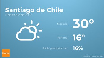 Hoy a primera hora en Santiago de Chile se esperan pocas nubes con escasa probabilidad de precipitaciones. Por la tarde se prevén cielos sin nubes. Por lo que respecta a las temperaturas, estas oscilarán entre los 30 grados de máxima y 16 de mínima. Además, se esperan vientos sin apenas intensidad con valores de hasta 41 kilómetros por hora.