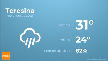Durante las primeras horas del día en Teresina tendremos cielos cubiertos con lluvia. Según pasen las horas se esperan nubes y claros con baja probabilidad de que haya precipitaciones. Las temperaturas se moverán entre una máxima de 31 y una mínima de 24 grados. Junto a todo esto, se esperan vientos de carácter débil con valores de hasta 18 km/h.