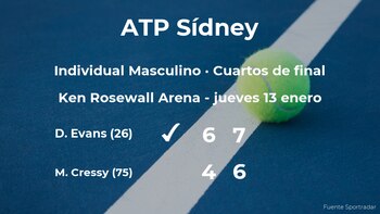 El británico Daniel Evans, número 26 de la ATP y cabeza de serie número 3, cumplió los pronósticos al vencer por 6-4 y 7(7)-6(5) en una hora y cincuenta y ocho minutos al tenista estadounidense Maxime Cressy, número 75 de la ATP, en los cuartos de final del torneo ATP 250 de Sídney. Con este resultado, seguiremos viendo al ganador del partido en las semifinales del torneo ATP 250 de Sídney.