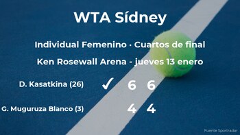 La jugadora española Garbine Muguruza Blanco, número 3 de la WTA y cabeza de serie número 2, cayó derrotada 6-4 y 6-4 en los cuartos de final del torneo WTA 500 de Sídney en una hora y veintiséis minutos contra la tenista rusa Darya Kasatkina, número 26 de la WTA. Con este resultado, la jugadora estará en las semifinales del torneo WTA 500 de Sídney.