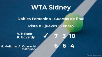 La alemana Vivian Heisen, número 102 de la WTA y la jugadora húngara Panna Udvardy, número 256 de la WTA dieron la sorpresa al vencer por 7(9)-6(7), 3-6 y 10-4 en una hora y treinta y siete minutos a la tenista estadounidense Nicole Melichar, número 12 de la WTA y a la tenista chilena Alexa Guarachi Mathison, número 13 de la WTA en los cuartos de final del torneo WTA 500 de Sídney. Tras este resultado, veremos a las vencedoras del partido en la siguiente fase del torneo WTA 500 de Sídney, las semifinales.