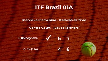 La jugadora bielorrusa Jana Kolodynska venció en los octavos de final del torneo de Blumenau en dos horas y dieciocho minutos por 6-4 y 7(9)-6(7) a Gabriela Ce, tenista brasileña, número 294 de la WTA y cabeza de serie número 2. Con este resultado, la ganadora estará en los cuartos de final del torneo de Blumenau.
