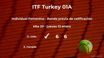 Ozlem Uslu, turca cumplió las previsiones al ganar por 6- y 6- a Ema Harajda, tenista checa en la ronda previa de calificación del torneo de Antalya. Con este resultado, seguiremos viendo a la jugadora en la siguiente fase del torneo de Antalya.