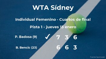 Paula Badosa, española, número 9 de la WTA y cabeza de serie número 5, cumplió las previsiones al ganar en los cuartos de final del torneo WTA 500 de Sídney en dos horas y treinta y nueve minutos por 7(8)-6(6), 3-6 y 6-3 a Belinda Bencic, tenista suiza, número 23 de la WTA. Con este resultado, la jugadora española estará en las semifinales del torneo WTA 500 de Sídney.