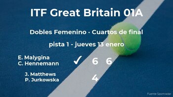 La tenista estonia Elena Malygina y la sueca Caijsa Wilda Hennemann, número 352 de la WTA cumplieron los pronósticos al ganar en los cuartos de final del torneo de Bath en una hora y siete minutos por 6-4 y 6- a las jugadoras británicas Jessica Matthews y Paulina Jurkowska. Con este resultado, las jugadoras estarán en las semifinales del torneo de Bath.