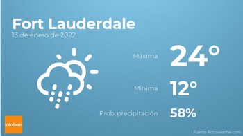 En las primeras horas del día en Fort Lauderdale tendremos más nubes que claros con probabilidad de alguna llovizna. A medida que avance el día se prevé nubes escasas. Las temperaturas se moverán entre una máxima de 24 y una mínima de 12 grados centígrados. Además, se esperan vientos de carácter débil con rachas de hasta 20 kilómetros por hora.