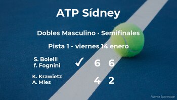 Los jugadores italianos Simone Bolelli y fabio Fognini, número 25 de la ATP y, número 111 de la ATP respectivamente ganaron por 6-4 y 6-2 en una hora y dieciocho minutos a los alemanes Kevin Krawietz y Andreas Mies, número 14 de la ATP y, número 50 de la ATP respectivamente en las semifinales del torneo ATP 250 de Sídney. Tras este resultado, la pareja estará en la final del torneo ATP 250 de Sídney.