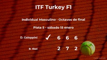 El tenista italiano Davide Galoppini y cabeza de serie número 6, cumplió los pronósticos al ganar en los octavos de final del torneo de Antalya por 6-2, 6(3)-7(7) y 6-2 a Berk Ilkel, tenista turco. Tras este resultado, veremos al vencedor del partido en los cuartos de final del torneo de Antalya.