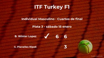 El jugador español Benjamin Winter Lopez y cabeza de serie número 7, cumplió las previsiones al ganar en una hora y treinta y dos minutos por 6- y 6-3 a Gerard Planelles Ripoll, tenista español en los cuartos de final del torneo de Antalya. Tras este resultado, Winter Lopez estará en las semifinales del torneo de Antalya.