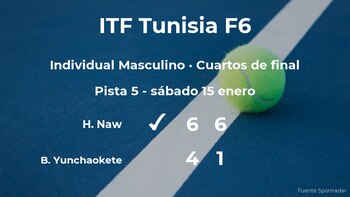 El jugador sirio Hazem Naw cumplió las previsiones al ganar por 6-4 y 6-1 al tenista chino Bu Yunchaokete en los cuartos de final del torneo de Monastir. Con este resultado, Naw estará en las semifinales del torneo de Monastir.