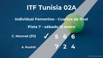 Carole Monnet, francesa, número 311 de la WTA y cabeza de serie número 6, ganó en los cuartos de final del torneo de Monastir por 5-7, 6-2 y 6-4 a Arlinda Rushiti, tenista suiza. Con este resultado, la jugadora francesa consigue clasificarse para las semifinales del torneo de Monastir.