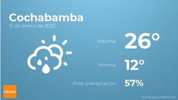 En la mañana de hoy en Cochabamba se esperan nubes y claros con probabilidad de lloviznas generalizadas. A medida que avance el día habrá nubes y claros con escasa probabilidad de precipitaciones. En cuanto a las temperaturas, estas oscilarán entre los 26 grados de máxima y 12 de mínima. Junto a todo esto, se esperan vientos del sureste de carácter débil con rachas de hasta 32 kilómetros por hora.