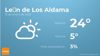 Hoy a primera hora en León de Los Aldama habrá nubes escasas. A medida que avance el día se esperan pocas nubes con poca probabilidad de lluvias. Con respecto a las temperaturas, oscilarán entre una máxima de 24 y una mínima de 5 grados. En general, vientos del suroeste de carácter débil con rachas de hasta 22 km/h.