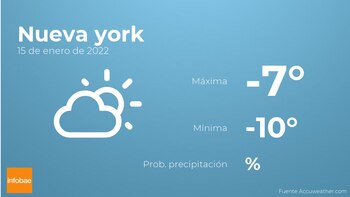 A lo largo de la mañana en Nueva york tendremos nubes y claros. Por la tarde se prevén cielos despejados. Por lo que respecta a las temperaturas, estas se moverán entre una máxima de -7 y una mínima de -10 grados. Viento del norte de carácter débil con valores de hasta 30 kilómetros por hora.