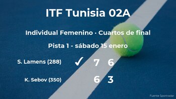 Suzan Lamens, neerlandesa, número 288 de la WTA y cabeza de serie número 2, venció por 7(7)-6(3) y 6-3 a la jugadora canadiense Katherine Sebov, número 350 de la WTA, en los cuartos de final del torneo de Monastir. Con este resultado, seguiremos viendo a la vencedora del partido en las semifinales del torneo de Monastir.