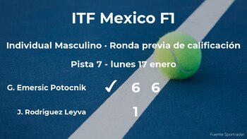 El jugador esloveno Gal Emersic Potocnik venció en la ronda previa de calificación del torneo de Cancún por 6-1 y 6- a Juan Manuel Rodriguez Leyva, tenista mexicano. Con este resultado, el ganador estará en la siguiente ronda del torneo de Cancún.