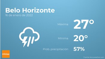 Para hoy en Belo Horizonte se prevén cielos cubiertos con probabilidad de tormentas acompañadas de lluvia. Con respecto a las temperaturas, estas variarán entre los 27 grados de máxima y 20 de mínima. En general, vientos del norte sin apenas intensidad con valores de hasta 24 kilómetros por hora.
