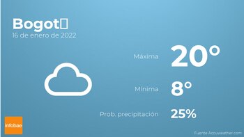 Para hoy por la mañana en Bogotá estará muy nublado con poca probabilidad de lluvias. A medida que avance el día tendremos más nubes que claros con baja probabilidad de que haya precipitaciones. Con respecto a las temperaturas, estas se moverán entre una máxima de 20 y una mínima de 8 grados. Viento del sureste de carácter flojo con valores de hasta 32 kilómetros por hora.