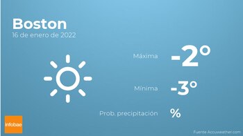 Para hoy por la mañana en Boston se prevén cielos sin nubes. Por la tarde el cielo estará cubierto con alguna precipitación aislada. Por lo que respecta a las temperaturas, estas variarán entre una máxima de -2 y una mínima de -3 grados centígrados. Además, se esperan vientos de carácter débil con valores de hasta 24 kilómetros por hora.