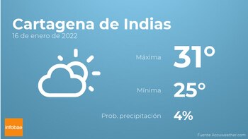 En la mañana de hoy en Cartagena de Indias habrá nubes y claros. Según pasen las horas se prevén más nubes que claros. En cuanto a las temperaturas, estas oscilarán entre los 31 grados de máxima y 25 de mínima. Junto a todo esto, se esperan vientos del noreste de carácter flojo con cifras de hasta 33 km/h.