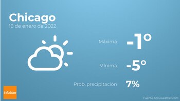 Durante las primeras horas del día en Chicago habrá nubes escasas. Por la tarde tendremos cielos cubiertos con probabilidad de algún episodio de precipitaciones aisladas. Por lo que respecta a las temperaturas, estas se moverán entre una máxima de -1 y una mínima de -5 grados centígrados. Además, se esperan vientos sin apenas intensidad con valores de hasta 13 kilómetros por hora.