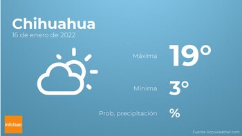 Durante la mañana en Chihuahua se esperan pocas nubes. A medida que avance el día tendremos nubes y claros. Las temperaturas estarán entre los 19 grados de máxima y 3 de mínima. Junto a todo esto, se esperan vientos del sur sin apenas intensidad con valores de hasta 24 kilómetros por hora.