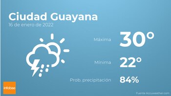 Durante la mañana en Ciudad Guayana se prevén nubes y claros con tormentas acompañadas de lluvia. A medida que avance el día tendremos más nubes que claros con baja probabilidad de que haya precipitaciones. Por lo que respecta a las temperaturas, estas variarán entre una máxima de 30 y una mínima de 22 grados centígrados. Viento del noreste de carácter flojo con valores de hasta 35 km/h.