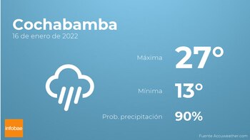 Durante las primeras horas del día en Cochabamba se prevén cielos cubiertos con lloviznas generalizadas e intermitentes. Por la tarde habrá cielos nubosos con poca probabilidad de precipitaciones. Las temperaturas se moverán entre una máxima de 27 y una mínima de 13 grados. Además, se esperan vientos de carácter flojo con valores de hasta 33 kilómetros por hora.