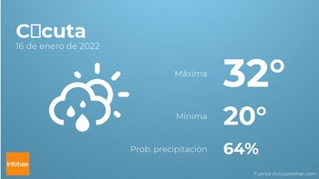 Hoy por la mañana en Cúcuta tendremos nubes y claros con probabilidad de lloviznas generalizadas e intermitentes. Por la tarde se prevén más nubes que claros con probabilidad de alguna precipitación aislada. En cuanto a las temperaturas, oscilarán entre una máxima de 32 y una mínima de 20 grados. En general, vientos de poca intensidad con cifras de hasta 28 kilómetros por hora.