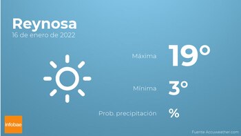 Durante las primeras horas del día en Reynosa se prevén cielos sin nubes. A medida que avance el día habrá cielos sin nubes. En cuanto a las temperaturas, estas oscilarán entre los 19 grados de máxima y 3 de mínima. En general, vientos del noroeste sin apenas intensidad con cifras de hasta 18 km/h.