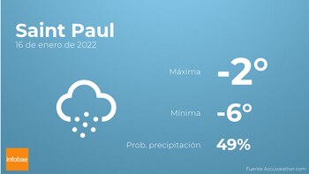 Para las primeras horas del día en Saint Paul el cielo estará cubierto con probabilidad de algún episodio de precipitaciones aisladas. Por la tarde el cielo estará cubierto con probabilidad de alguna precipitación aislada. Con respecto a las temperaturas, oscilarán entre una máxima de -2 y una mínima de -6 grados centígrados. En general, vientos del suroeste de carácter flojo con rachas de hasta 20 km/h.