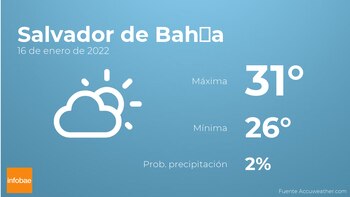 Para las primeras horas del día en Salvador de Bahía se prevé escasa nubosidad. Según pasen las horas habrá más nubes que claros con lloviznas generalizadas e intermitentes. Con respecto a las temperaturas, oscilarán entre una máxima de 31 y una mínima de 26 grados. Junto a todo esto, se esperan vientos del sureste de carácter débil con rachas de hasta 32 kilómetros por hora.