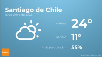 En las primeras horas del día en Santiago de Chile habrá nubes y claros con probabilidad de algún episodio de precipitaciones aisladas. Por la tarde se esperan nubes y claros con poca probabilidad de lluvias. Las temperaturas estarán entre una máxima de 24 y una mínima de 11 grados. En general, vientos del suroeste de carácter débil con cifras de hasta 43 km/h.