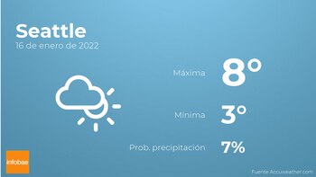 Durante la mañana en Seattle tendremos más nubes que claros. A medida que avance el día estará muy nublado. Las temperaturas se moverán entre una máxima de 8 y una mínima de 3 grados. Junto a todo esto, se esperan vientos del norte sin apenas intensidad con valores de hasta 7 kilómetros por hora.