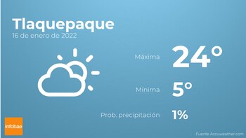 En las primeras horas del día en Tlaquepaque se esperan nubes y claros. Según pasen las horas habrá nubes y claros con poca probabilidad de precipitaciones. Las temperaturas estarán entre los 24 grados de máxima y 5 de mínima. Junto a todo esto, se esperan vientos sin apenas intensidad con cifras de hasta 22 kilómetros por hora.