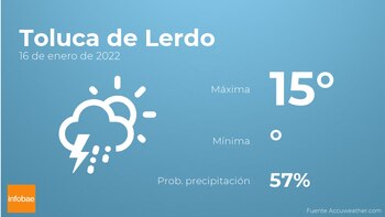 Hoy en Toluca de Lerdo habrá nubes y claros con probabilidad de tormentas y lluvia. Además, se esperan vientos del oeste de carácter débil con rachas de hasta 30 km/h.