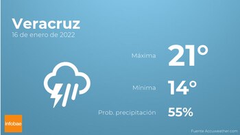 Durante las primeras horas del día en Veracruz tendremos cielos cubiertos con probabilidad de tormentas y lluvia. Por la tarde se prevén nubes y claros con poca probabilidad de lluvias. Por lo que respecta a las temperaturas, estas se moverán entre los 21 grados de máxima y 14 de mínima. En general, vientos de carácter flojo con rachas de hasta 67 km/h.