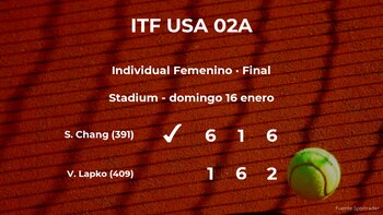 Sophie Chang, estadounidense, número 391 de la WTA y cabeza de serie número 7, ganó en la final del torneo de Vero Beach por 6-1, 1-6 y 6-2 a la bielorrusa Vera Lapko, número 409 de la WTA y cabeza de serie número 4. Tras este resultado, la tenista se convierte en la nueva campeona del torneo de Vero Beach.