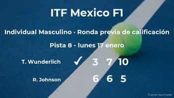 Ty Wunderlich, estadounidense ganó en la ronda previa de calificación del torneo de Cancún por 3-6, 7-6 y 10-5 a Ryan Johnson, tenista estadounidense. Con este resultado, el ganador añade nuevos puntos a su ranking para poder acceder al torneo de Cancún.