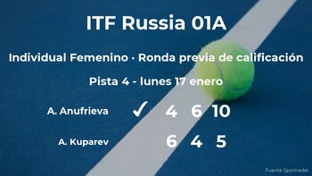 La jugadora rusa Anastasia Anufrieva venció en la ronda previa de calificación del torneo de Kazán por 4-6, 6-4 y 10-5 a la alemana Anastasiya Kuparev. Con este resultado, la ganadora añade nuevos puntos a su ranking para acceder al torneo de Kazán.