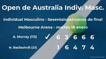 El tenista británico Andy Murray, número 113 de la ATP, cumplió las previsiones al vencer en tres horas y cincuenta y ocho minutos por 6-1, 3-6, 6-4, 6(5)-7(7) y 6-4 al georgiano Nikoloz Basilashvili, número 23 de la ATP y cabeza de serie número 21, en los sesentaicuatroavos de final del Open de Australia. Con este resultado, el ganador estará en los treintaidosavos de final del Open de Australia.