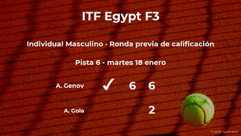El búlgaro Anthony Genov cumplió las previsiones al ganar en la ronda previa de calificación del torneo de El Cairo por 6- y 6-2 en una hora y diecinueve minutos a Andrea Gola, tenista italiano. Con esta victoria, Genov consigue sumar nuevos puntos a su ranking para participar en el torneo de El Cairo.